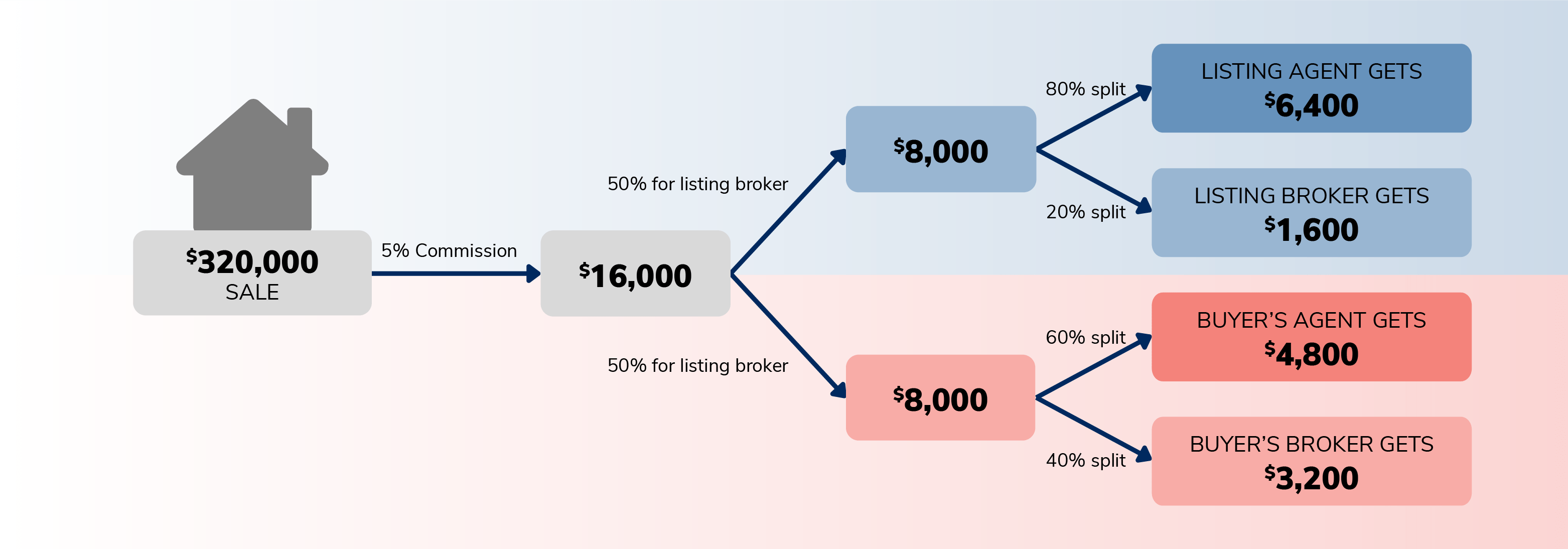 Let's say you list a property for $400,000 with a 6% commission. When the home sells, your listing broker gets paid 6% of $400k, or $24,000. Half goes to the broker of the buyer's agent, so each broker ends up with $12,000. Since you and your broker have agreed upon a 60/40 commission split, you will get 60% of the $12,000, or $7,200. Your broker will get 40% of $12,000, or $4,800. The commission split between the buyer's agent and the broker of the buyer's agent is 50/50, which leaves them with $6,000 each.